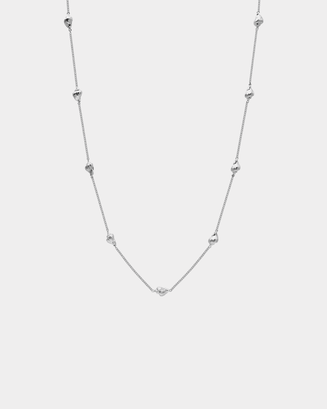 A delicate chain adorned with intricate hand-carved shells, connected by our signature organic ring clasp that becomes part of the design itself.